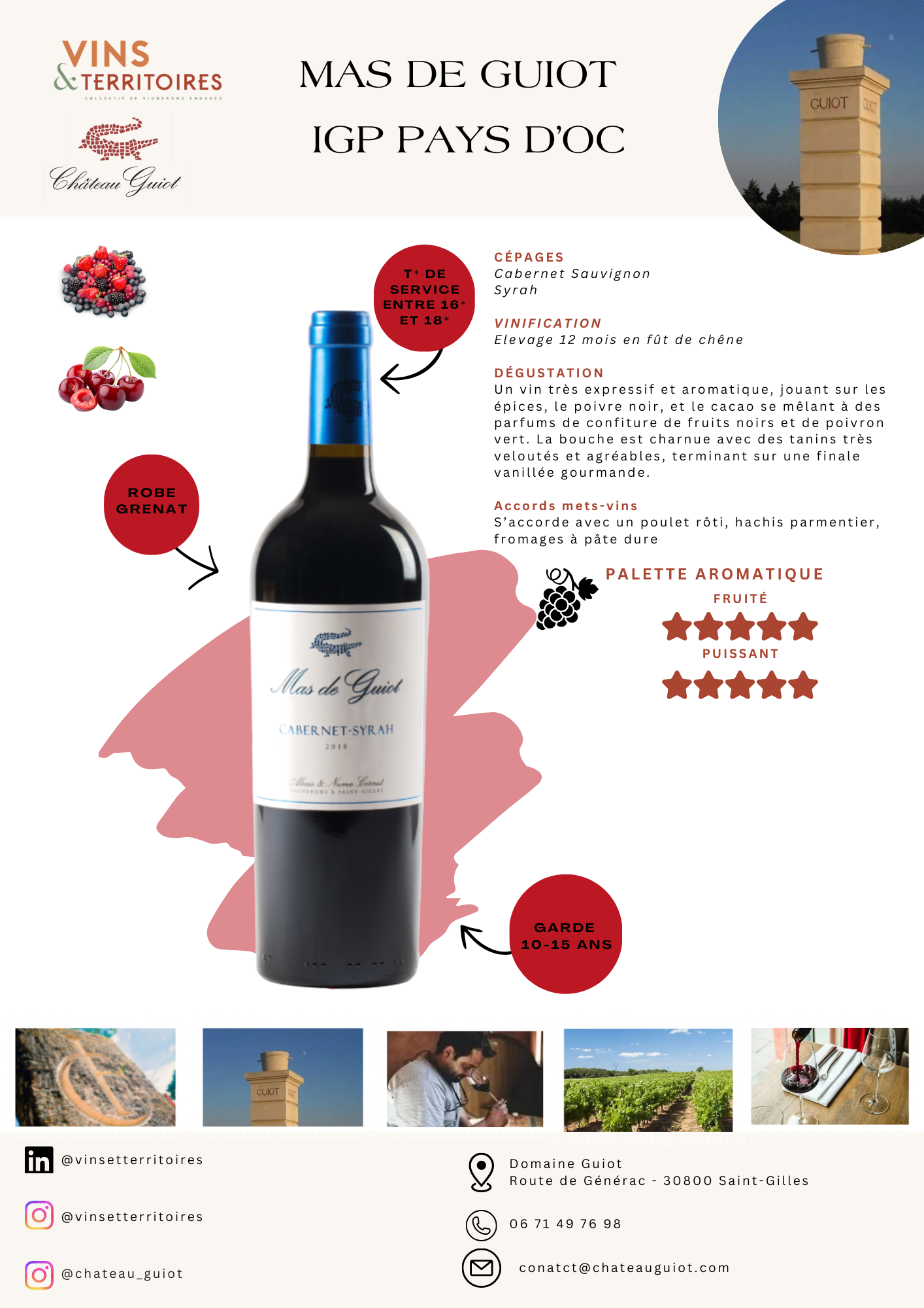 D'une robe grenat, ce vin gourmand, souple et rond en bouche, aux arômes envoutants de griotte, raisin, et essences de garrigue. Un vin très convivial, adapté à toutes les occasions.