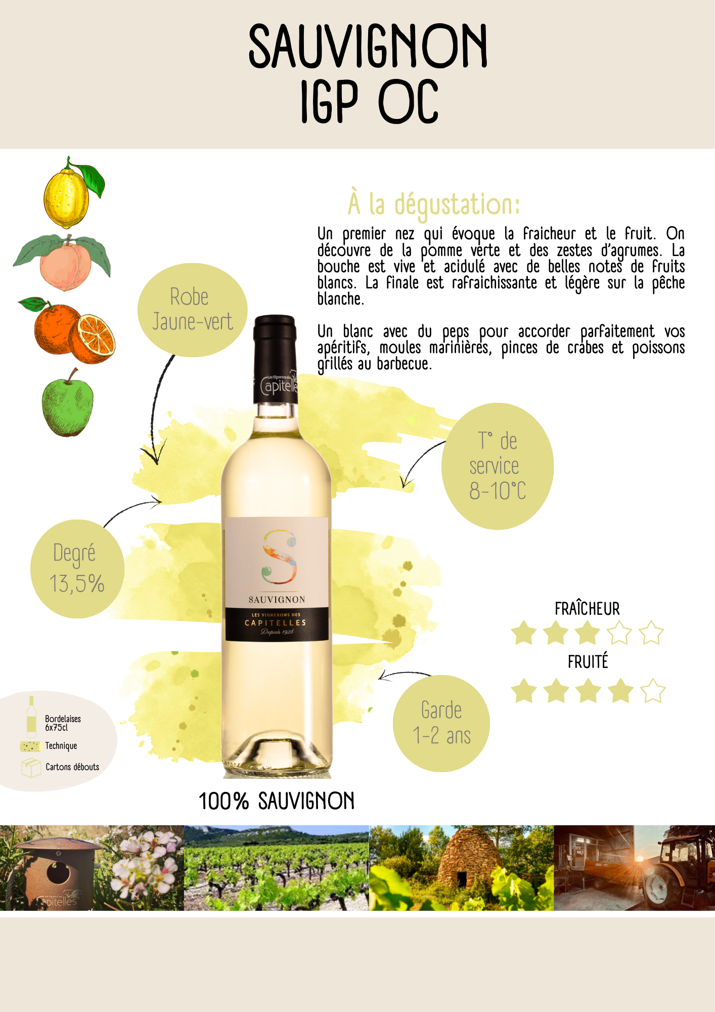 Blanc vif et croquant, agrumes et fleurs blanches. Un basique international qui séduit par sa fraîcheur et assure une sortie rapide en CHR et cavistes.
