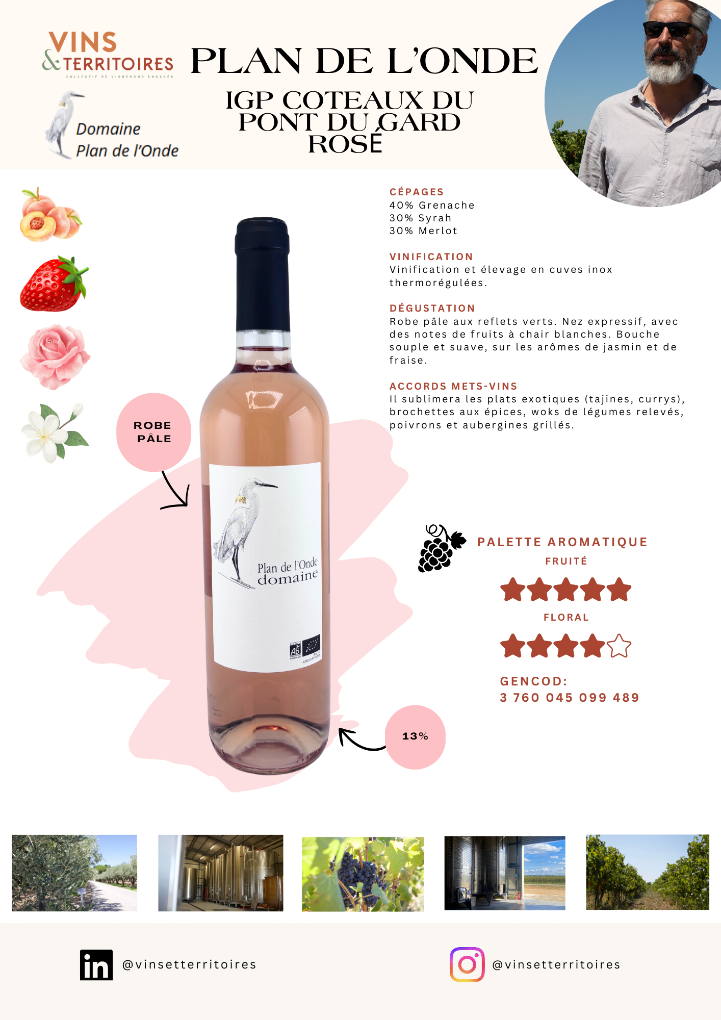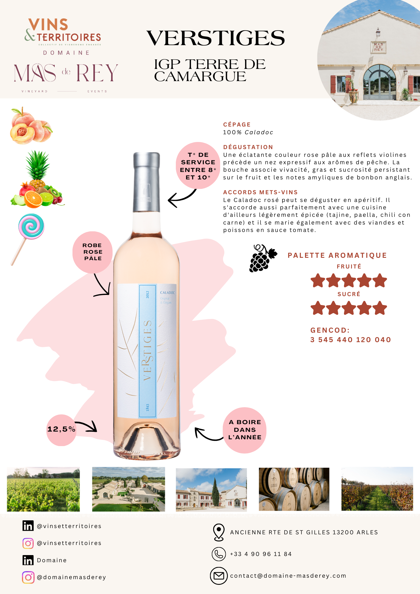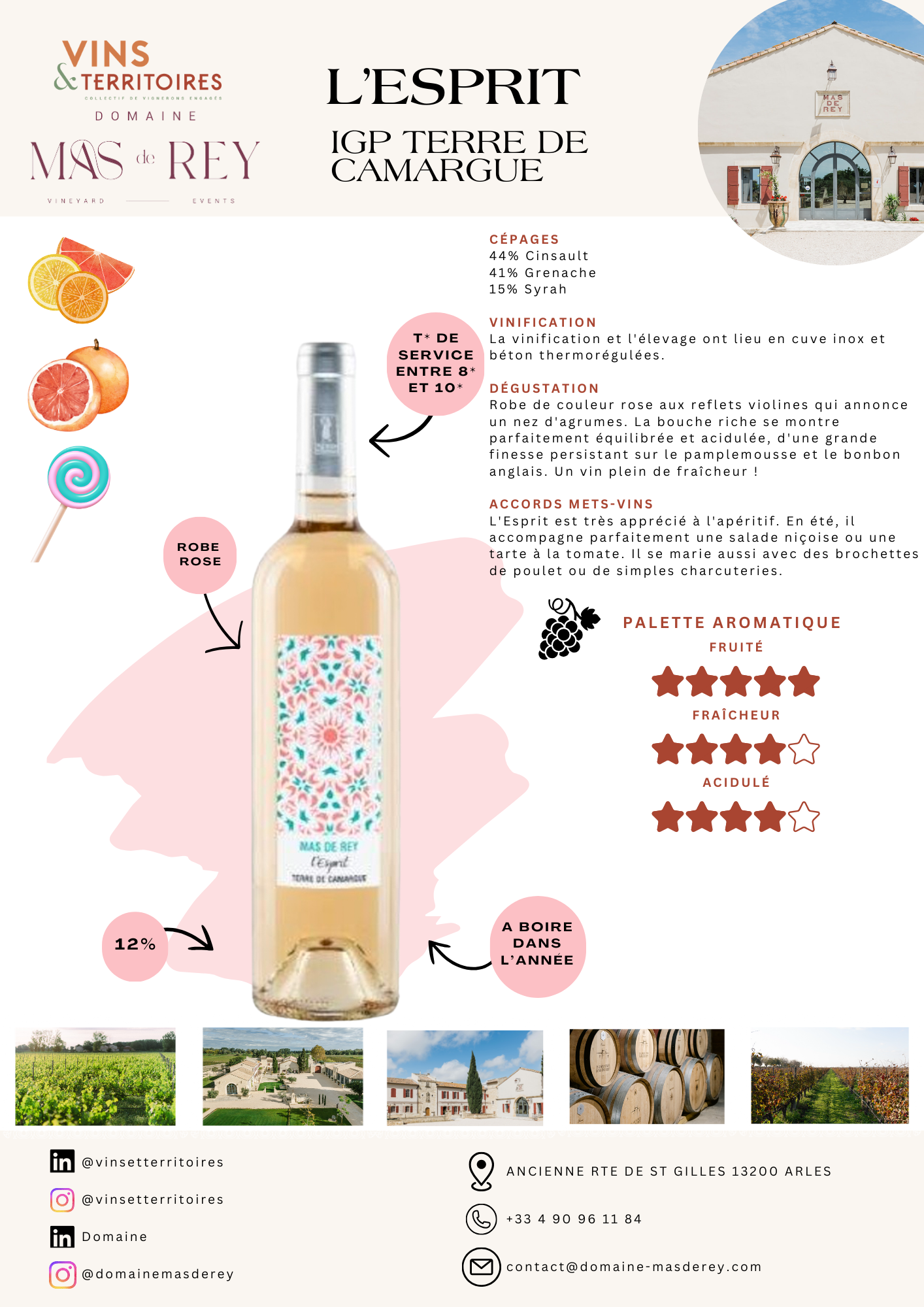 Rosé clair, agrumes et pamplemousse. Produit de rotation estivale, parfait pour terrasses et évènements, valorisable comme “rosé de Camargue” alternatif au Provence plus onéreux.