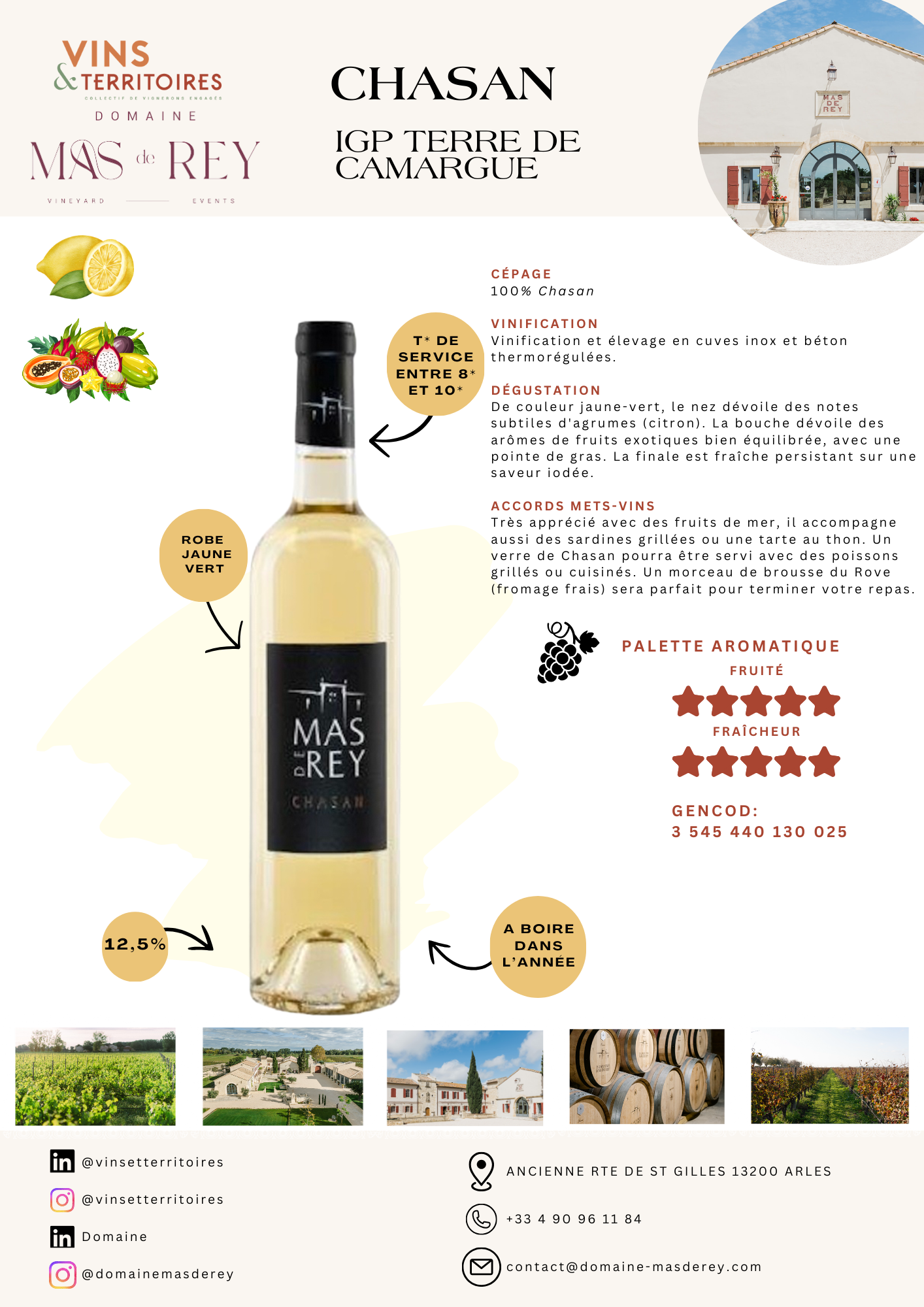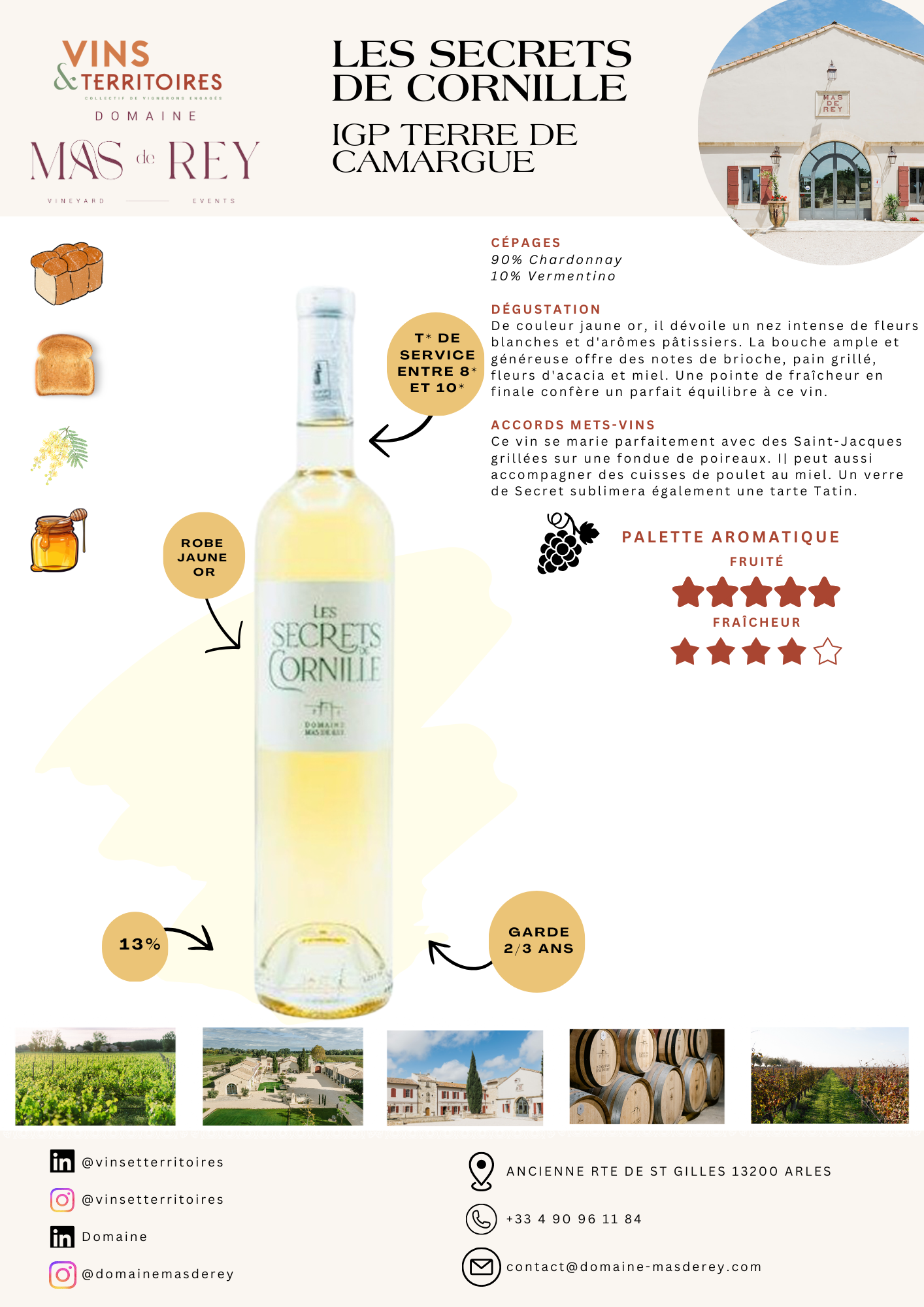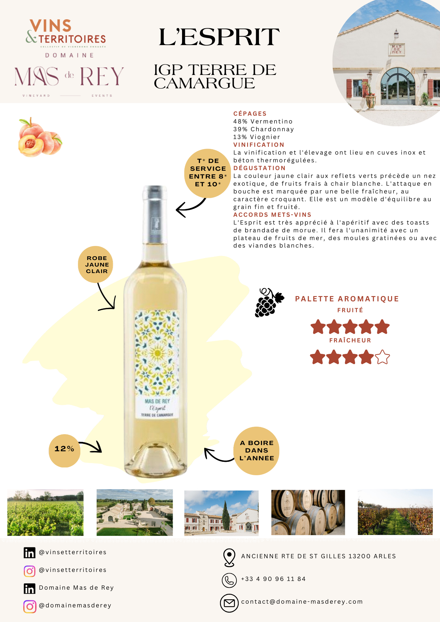 Notes de fleurs blanches, brioche, miel. Blanc premium idéal pour cavistes ou restaurants qui veulent un Camargue valorisant, à placer sur poissons raffinés et accords gastronomiques.